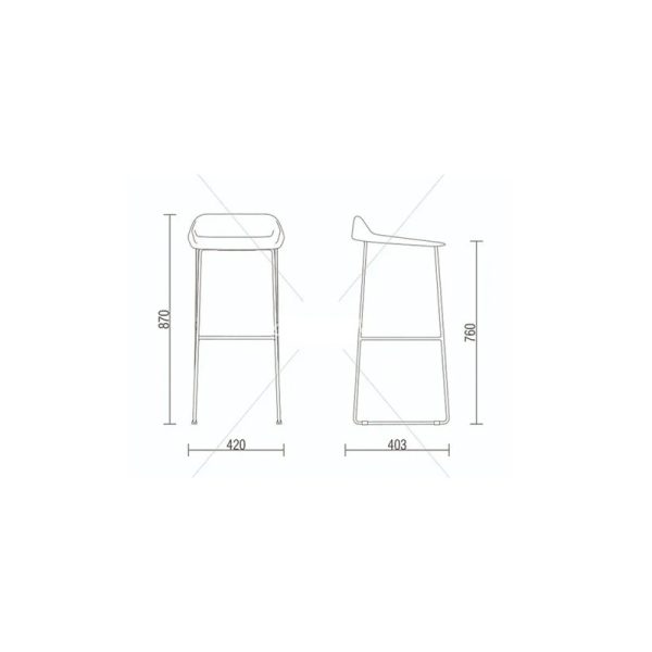 Estrutura da banqueta em formato trapezoidal, manufaturada em aço trefilado cilíndrico maciço, de diâmetro externo mínimo de 11,00 mm. dispõe de apoia pés no mesmo material, tratamento de superfície passando pelo processo de deposição eletrostática, com desengraxe e em seguida processo de cromo. altura do assento em relação ao piso de 760 mm.