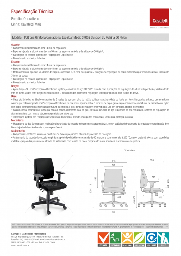 Tipo de Mecanismo Mecanismos Sincron com 4 estágios de regulagem e travamento da posição desejada do encosto, ou relax livre. Possui ajuste de tensão da mola por manípulo frontal.