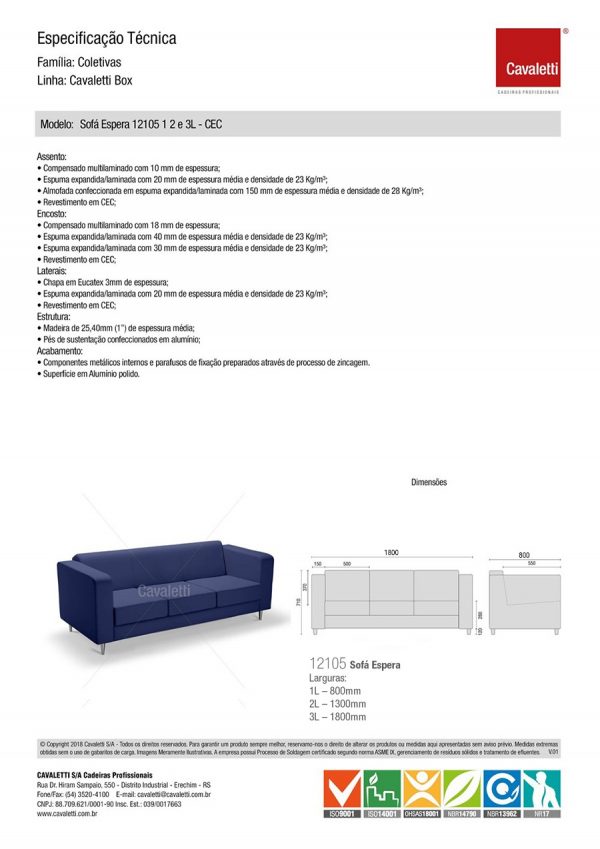 | Modelo | Sofá Espera 12105 3 Lugares – Pé de Apoio em Alumínio SB1210503 |